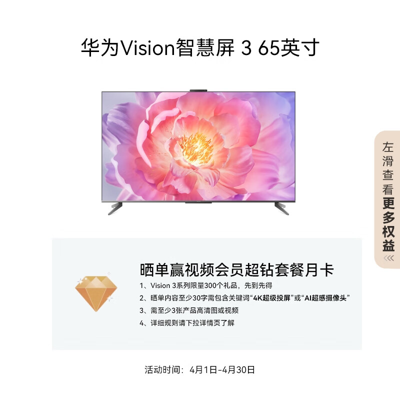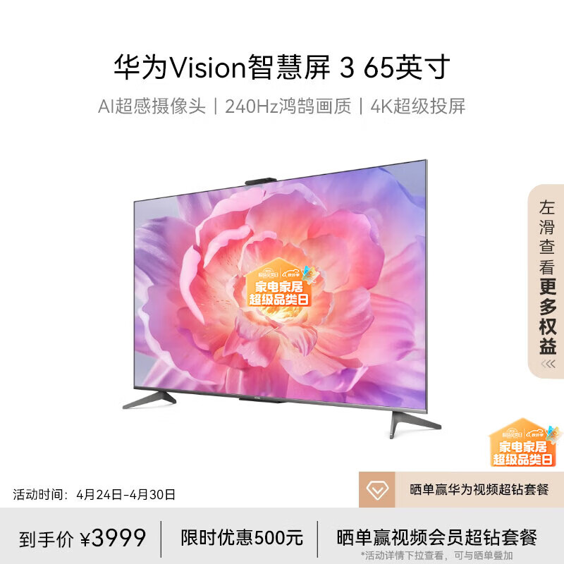 华为Vision智慧屏 3 65英寸 Pura 70投屏好搭档 AI摄像头240Hz屏超高清智能液晶电视机HD65QINA价格:3999.00元!