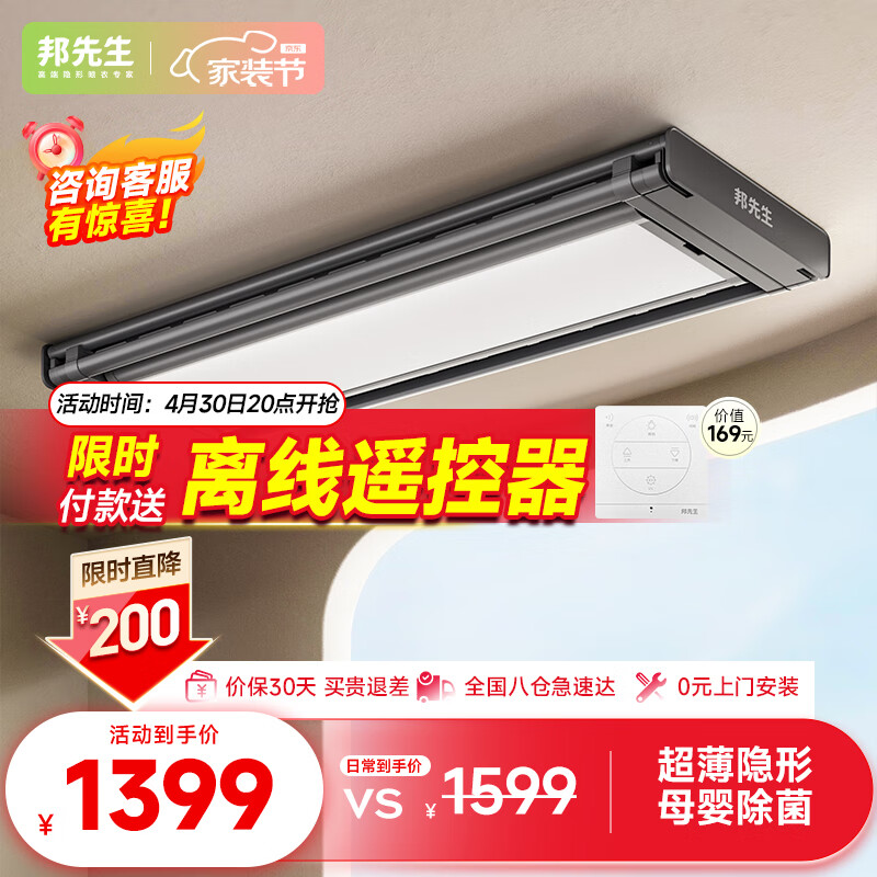 邦先生超薄隐形嵌入式电动晾衣架全自动智能升降阳台消毒凉晒衣机M22C灰价格:1899.00元!