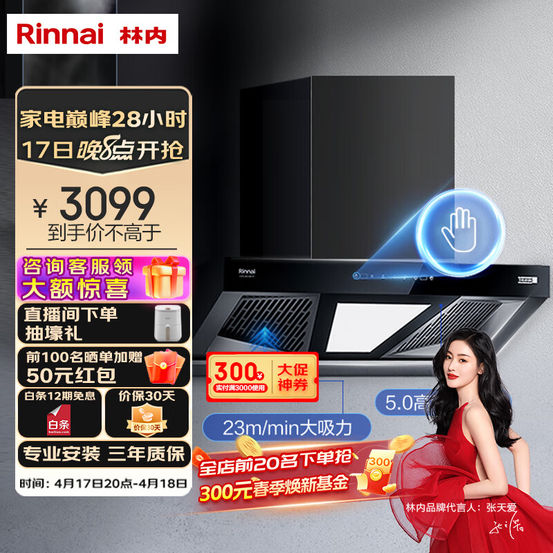 林内(Rinnai)欧式跨界抽烟机 23立方大吸力 挥手智控 自热清洗油烟机 CXW-283-NM11T价格:3099.00元!