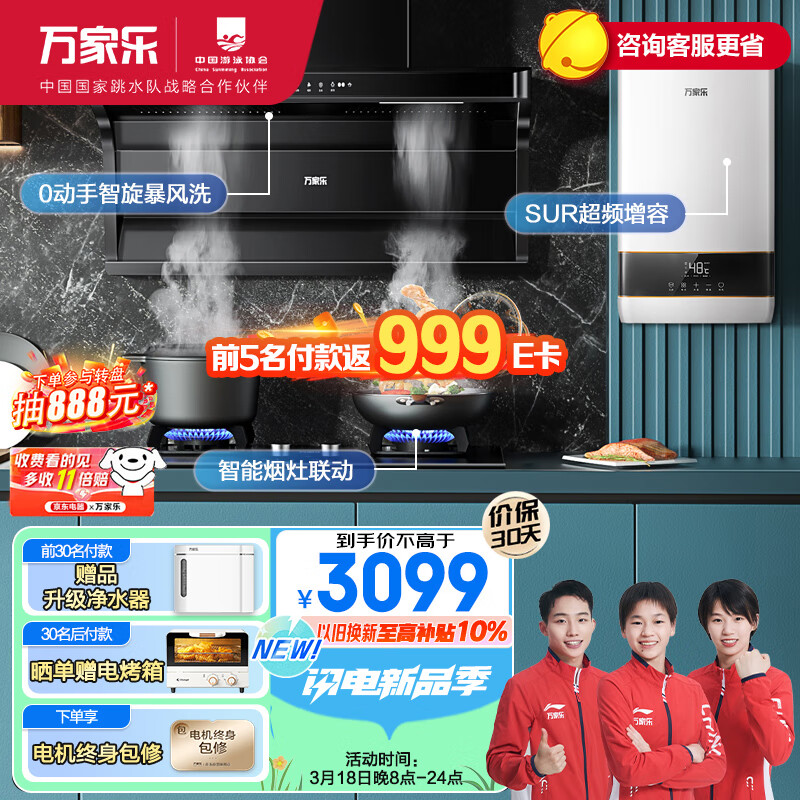 万家乐 抽油烟机 顶侧双吸油烟机 23m3/min烟灶热三件套四季随温感16L热水器AK6+KV063B+16D5S天然气价格:3199.00元!
