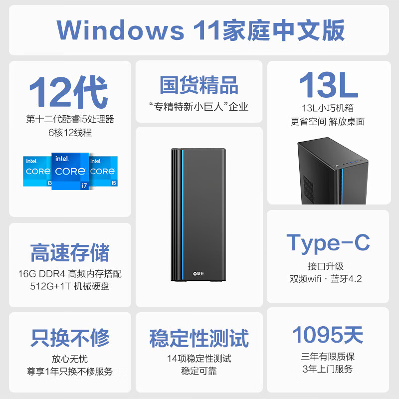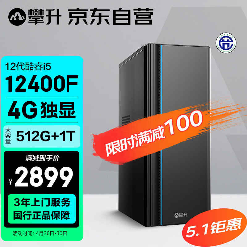 攀升 商睿3 办公商用家用台式电脑台式机组装电脑主机全套(12代酷睿i5 16G 512G+1T 4G独显)价格:2999.00元!