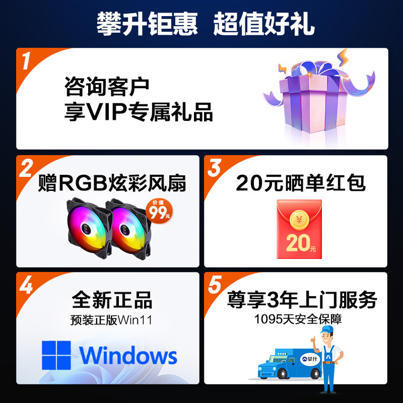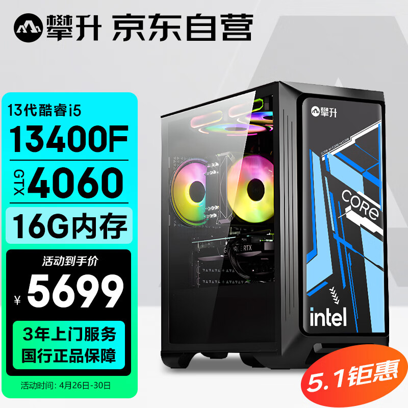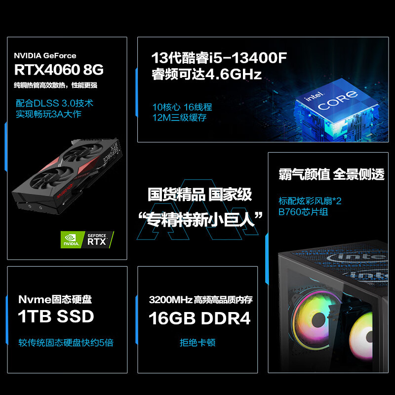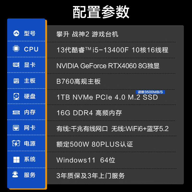 攀升 战神2 酷睿i5设计师电竞游戏台式电脑主机(13代i5-13400F RTX4060 8G显卡 16G 1TB SSD WiFi)价格:5699.00元!