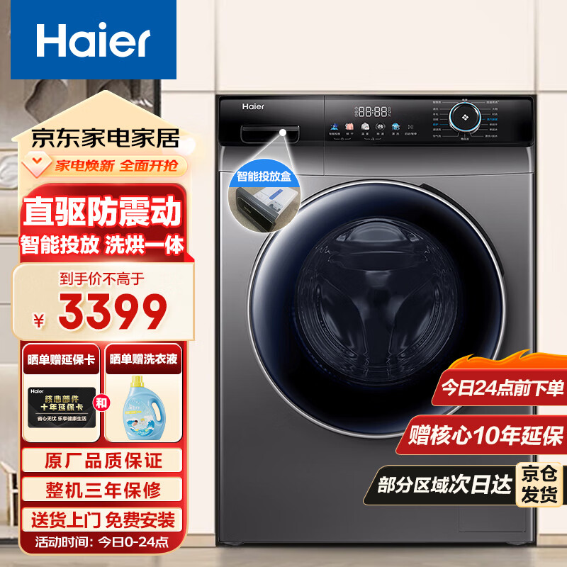 海尔(Haier)10KG滚筒洗衣机全自动直驱变频一级能效家用大容量蒸汽空气洗除菌智能投放+洗烘一体EG10012HBD55S价格:3399.00元!