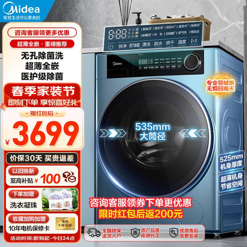 美的滚筒洗衣机洗烘一体带烘干全自动家用10公斤大容量超薄全嵌医护级除真菌一级能效以旧换新S1价格:3699.00元!