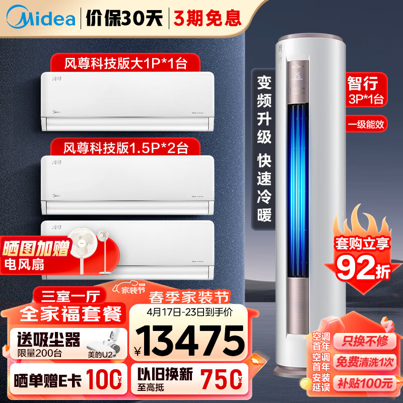 美的(Midea)空调套装 三室一厅(大1匹风尊科技一级+1.5匹风尊科技一级挂机*2+3匹智行柜机一级)一套购齐价格:14646.00元!