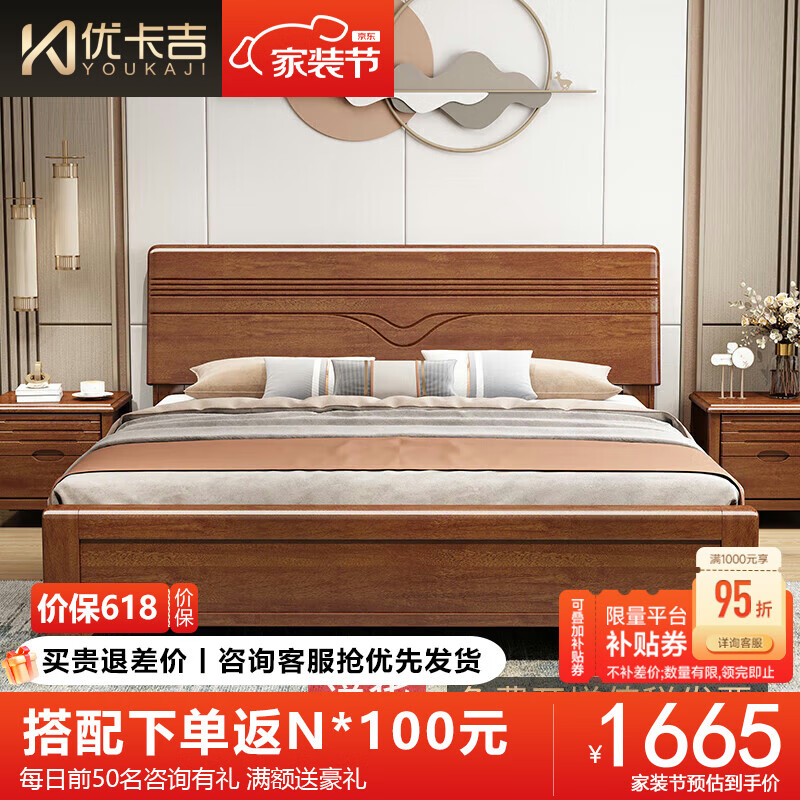 优卡吉胡桃木实木床新中式经济型1.5/1.8米双人储物床668# 1.8米箱框床价格:2069.00元!