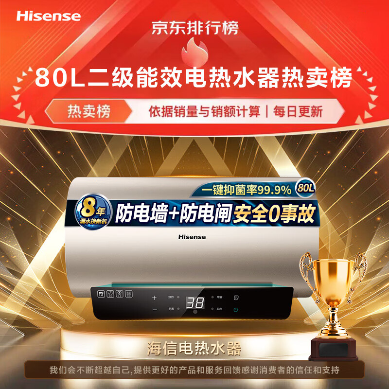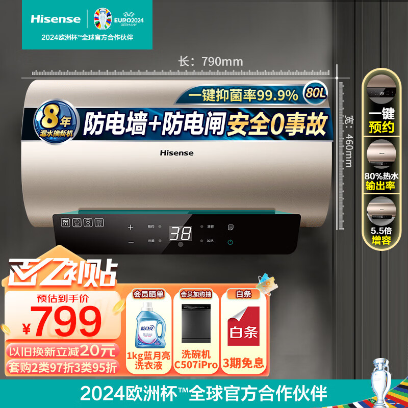 海信(Hisense)80升家用电热水器2100W速热5.5倍增容大屏触控自清洁智能预约双重防电保护DC80-W1513T以旧换新价格:799.00元!