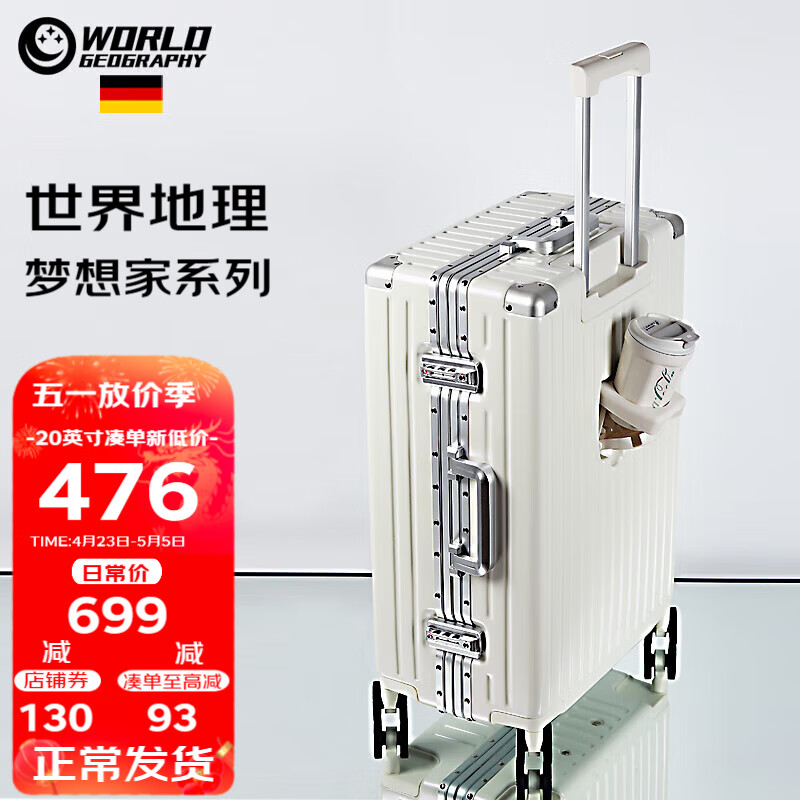 地理德国行李箱男女20英寸登机旅行箱铝框拉杆箱万向轮密码箱 象牙白价格:699.00元!