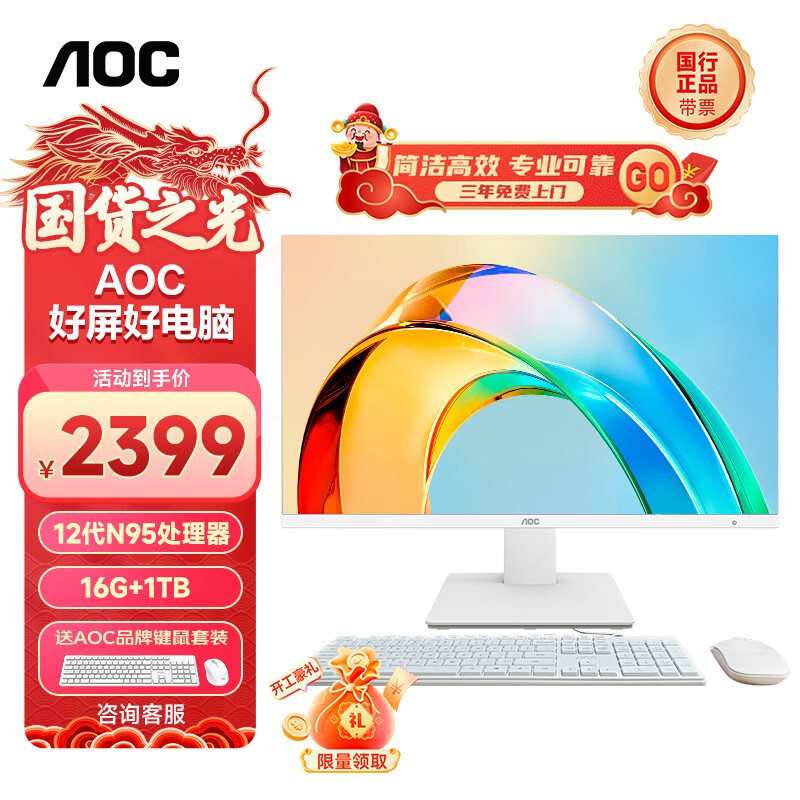 AOC 大师926 27英寸高清网课学习办公一体机电脑台式主机(12代N95 16G 1T SSD WiFi6 商务键鼠) 白价格:2399.00元!