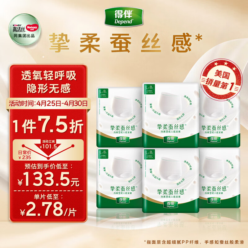 得伴Depend拉拉裤成人 L48片臀围95-120cm老年人内裤尿不湿价格:178.00元!
