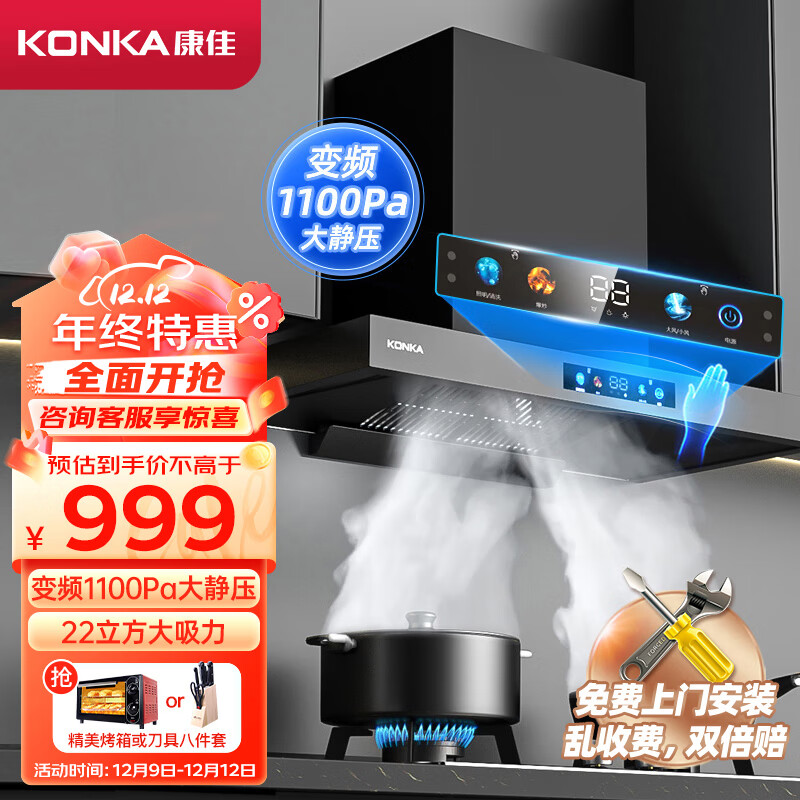 康佳(KONKA)欧式抽油烟机 变频1100Pa大静压 家用22立方爆炒大吸力 8档风速顶吸式排烟机 CXW-280-KT60B价格:1099.00元!