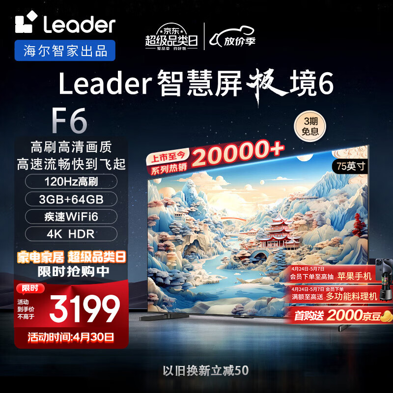 Leader海尔智家出品L75F6 75英寸小超跑智慧屏120Hz高刷游戏电视WiFi6护眼3GB+64GB一触投屏排行前十名85价格:3199.00元!