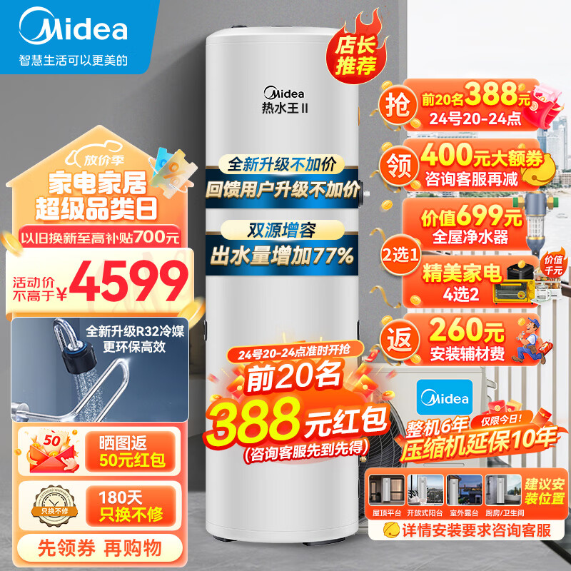 美的(Midea)空气能热水器家用200升包安装升级R32冷媒节能电辅速热75℃高温热水王二代RSJF-33/DN8-200D(E2)价格:4799.00元!