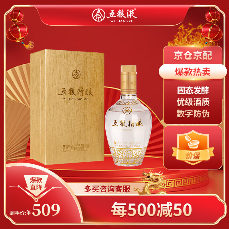 五粮液股份 五粮精酿 拉丝金 浓香型白酒 52度 500ml 单瓶 送礼宴饮价格:559.00元!