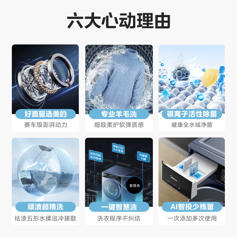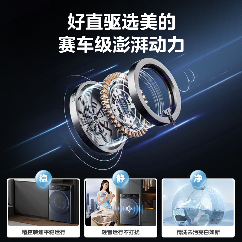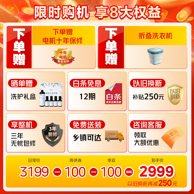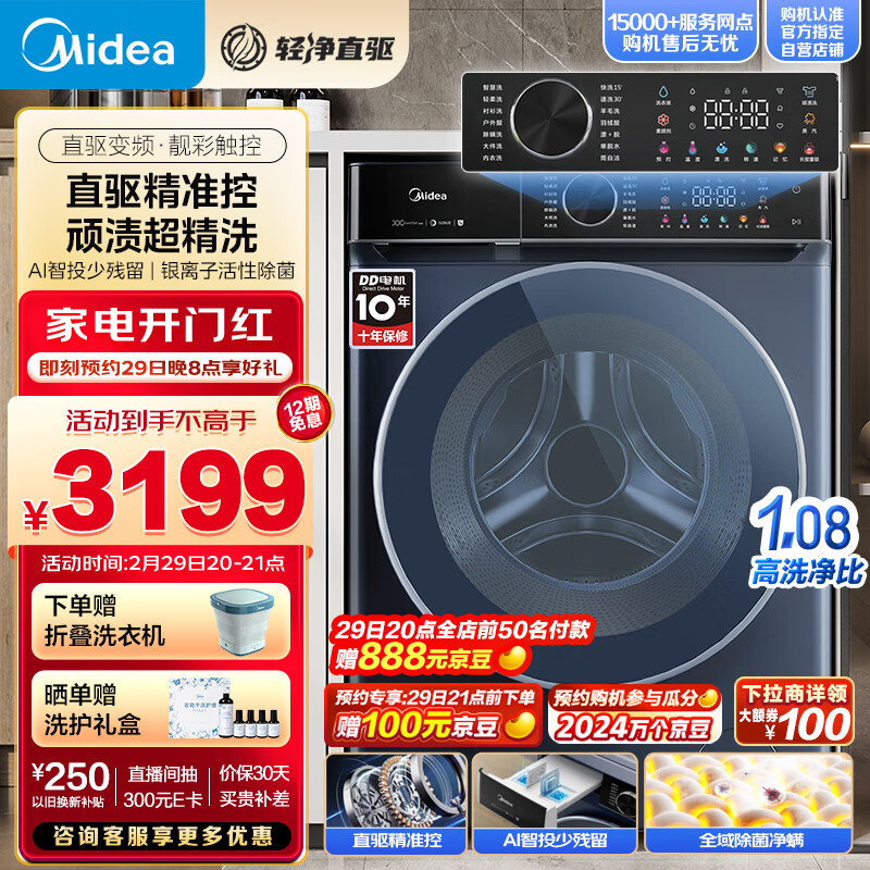 美的(Midea)滚筒洗衣机全自动 轻净直驱系列 直驱变频 顽渍超净洗 自动投放 银离子除菌 10公斤 MG100-933IADE价格:3199.00元!