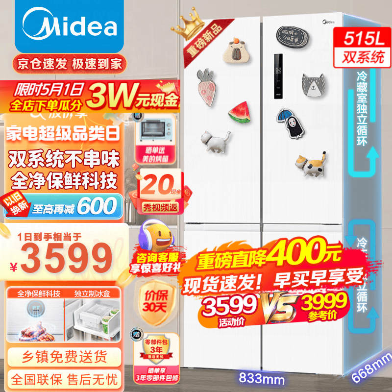 美的(Midea)540十字四开门对开门变频一级能效双系统双循环大容量净味风冷无霜独立制冰盒智能冰箱 MR-540WSPZE价格:3999.00元!