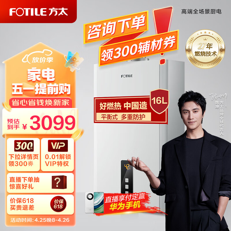 方太燃气热水器 家用16升天然气平衡式防冻智能精控恒温热水器 浴室可安装全家安心用 JSG31-D16E2价格:3099.00元!