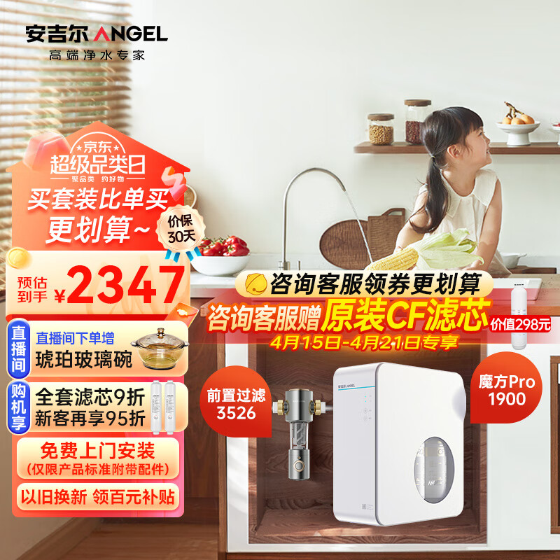 安吉尔净水器家用过滤器套装【魔方pro1900+前置过滤器3526】RO反渗透厨下式直饮机800G体验价格:2347.00元!
