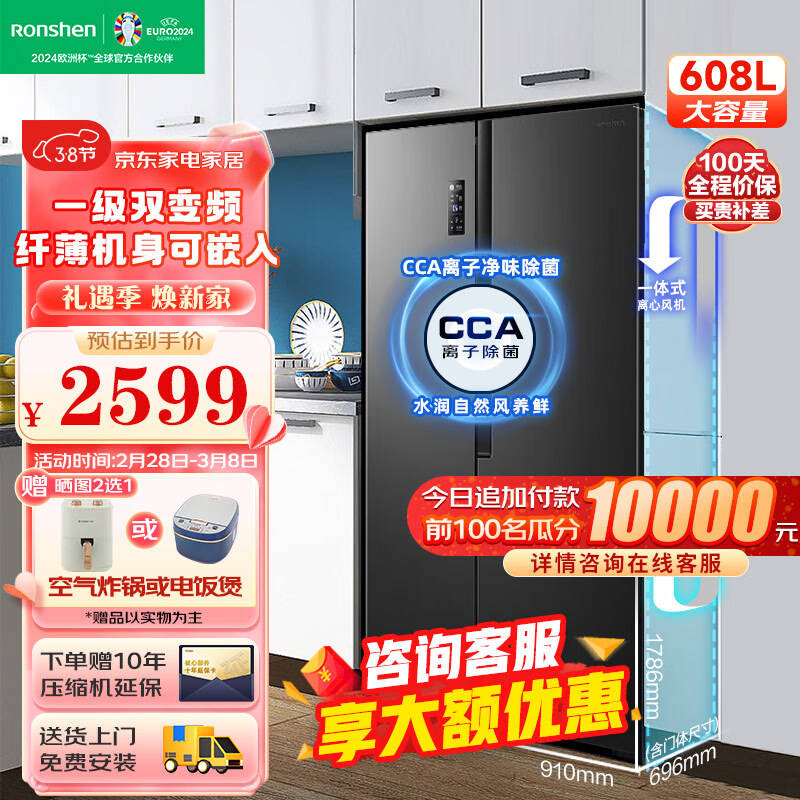 容声(Ronshen)608L对开门纤薄可嵌入式大容量双开门净味二门风冷无霜一级超薄冰箱BCD-608WD18HP价格:2699.00元!