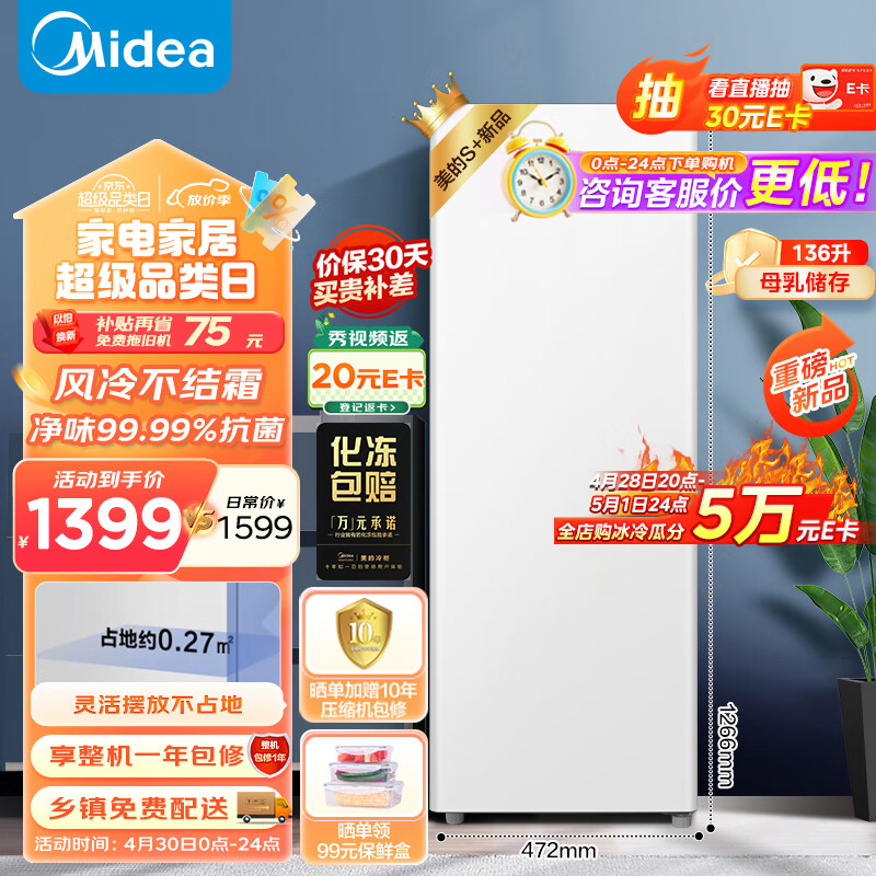 美的136升 风冷无霜立式家用冰柜 母乳冷藏冷冻转换柜抽屉式冷柜小型全冷冻一级能效冰箱 BD/BC-136WEM价格:1499.00元!