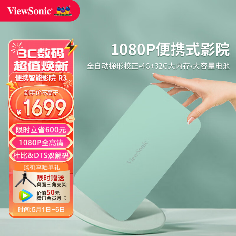 优派R3 投影仪家用 投影机 便携户外 精致露营 音乐投影 (1080P内置电池 全自动梯形校正 无线同屏)价格:2299.00元!