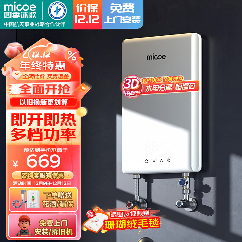 四季沐歌(MICOE)电热水器即热式 家用洗澡淋浴恒温免储水扁桶超薄过水热变频智能机 上门安装 DSK-H75-MS02【7500W变频】价格:799.00元!