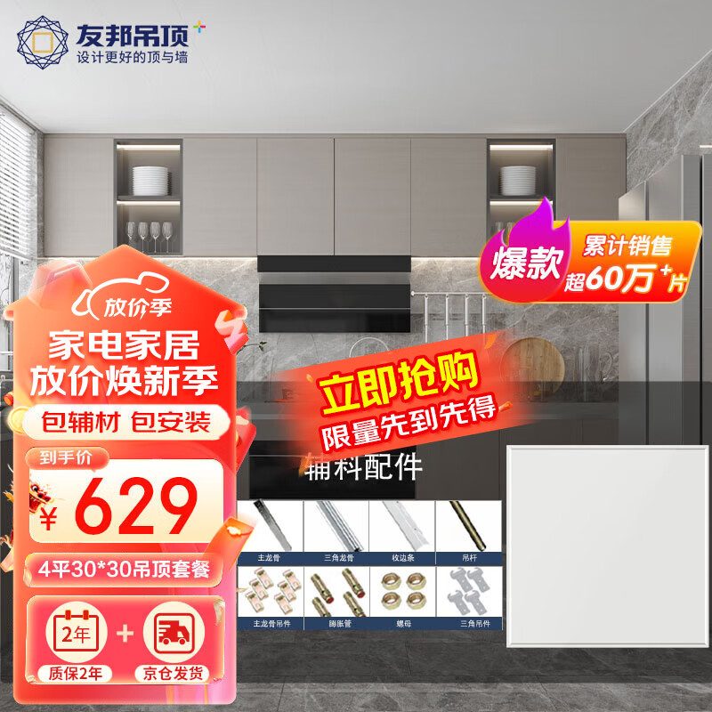 友邦(YOUPON) 集成吊顶铝扣板厨房阳台卫生间吊顶铝扣板天花板材料套餐包安装 主推4平【芳华】XD1467价格:999.00元!