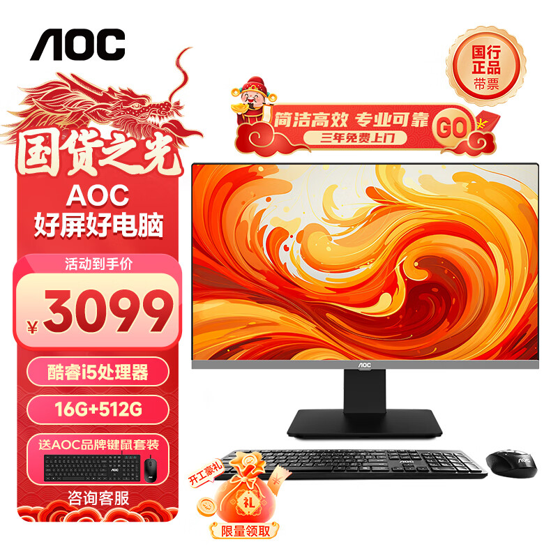 AOC大师926 27英寸高清办公台式一体机电脑(11代酷睿i5处理器 16G 512G 双频WiFi 3年上门 键鼠)黑价格:3099.00元!