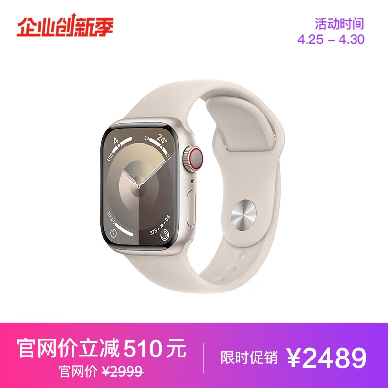 Apple Watch Series?9 (GPS);41?毫米星光色铝金属表壳;星光色运动型表带 - M/L MR8U3CH/A*企业专享价格:2489.00元!