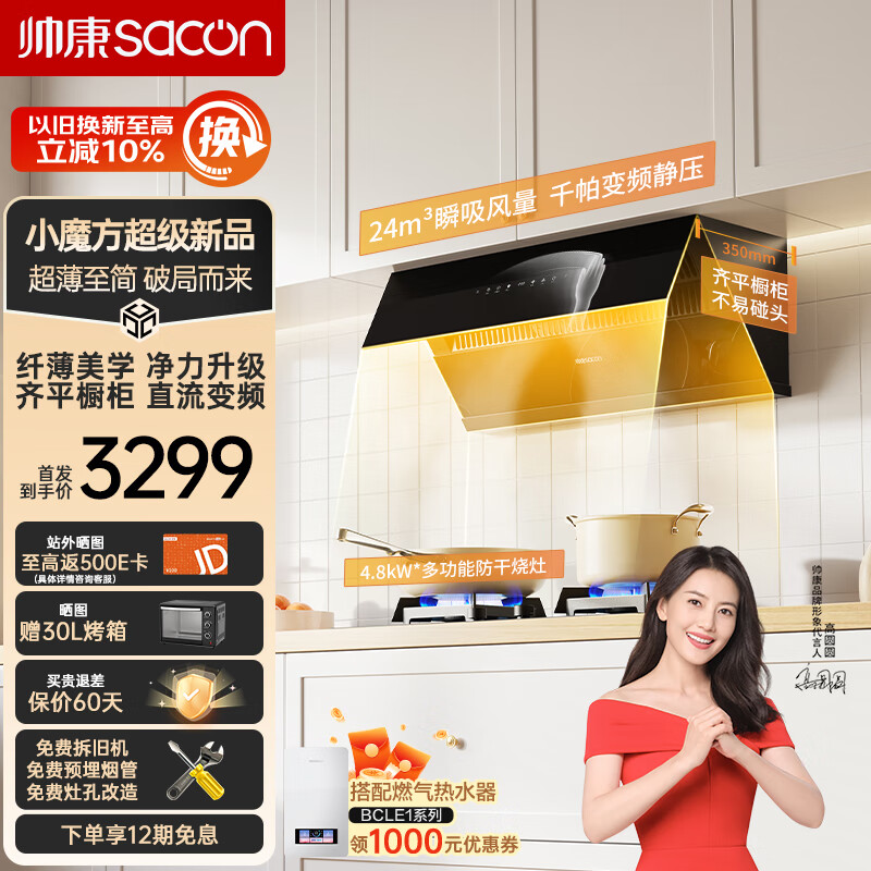 帅康(Sacon)抽油烟机 超薄侧吸 家用24m3爆炒大风量自清洗超薄侧吸搭配防干烧灶套装C8315+E8T01F液化气价格:3299.00元!