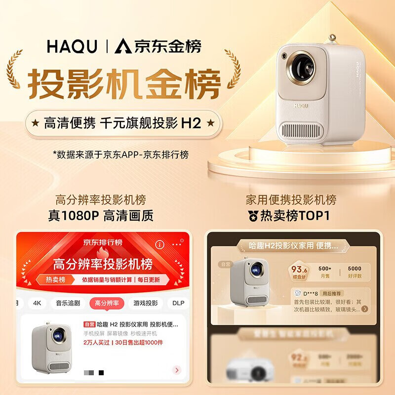 哈趣 H2 投影仪家用 投影机便携露营 智能家庭影院(400CVIA流明 TOF无感对焦 支持充电宝供电)价格:999.00元!