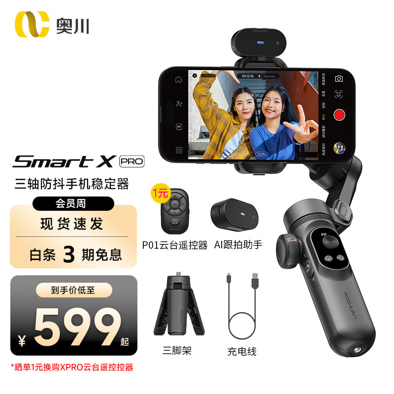 奥川Smart X Pro AI跟拍稳定器手机云台手持三轴防抖直播跟随vlog折叠平衡自拍杆支架带三脚架黑色价格:599.00元!