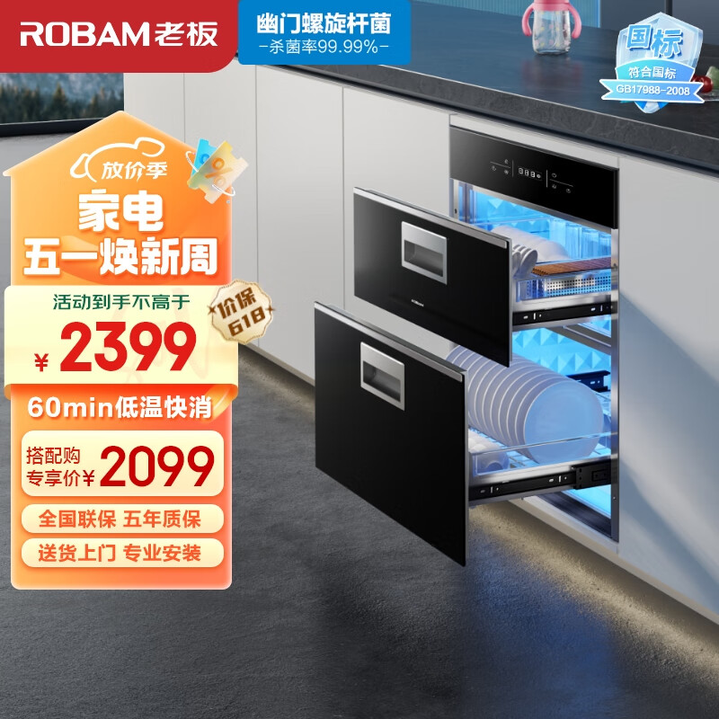 老板(Robam)消毒柜家用 嵌入式消毒碗柜105L双层大容量低温快消自动换气 碗筷餐具二紫外线杀菌消毒XZ716A价格:2399.00元!