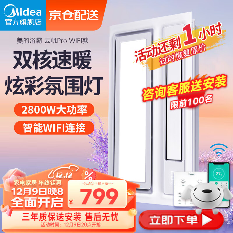 美的(Midea)风暖浴霸排气扇照明一体暖风机浴室集成吊顶智能双电机云帆pro价格:849.00元!