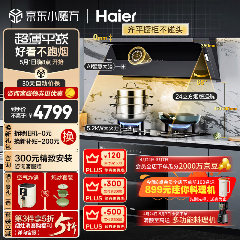 海尔(Haier)抽油烟机 超薄近吸 烟灶消三件套 24m3/min有效风 5.2KW大火力 医疗级消毒C30+Q2BE3天+E07JU1价格:4799.00元!
