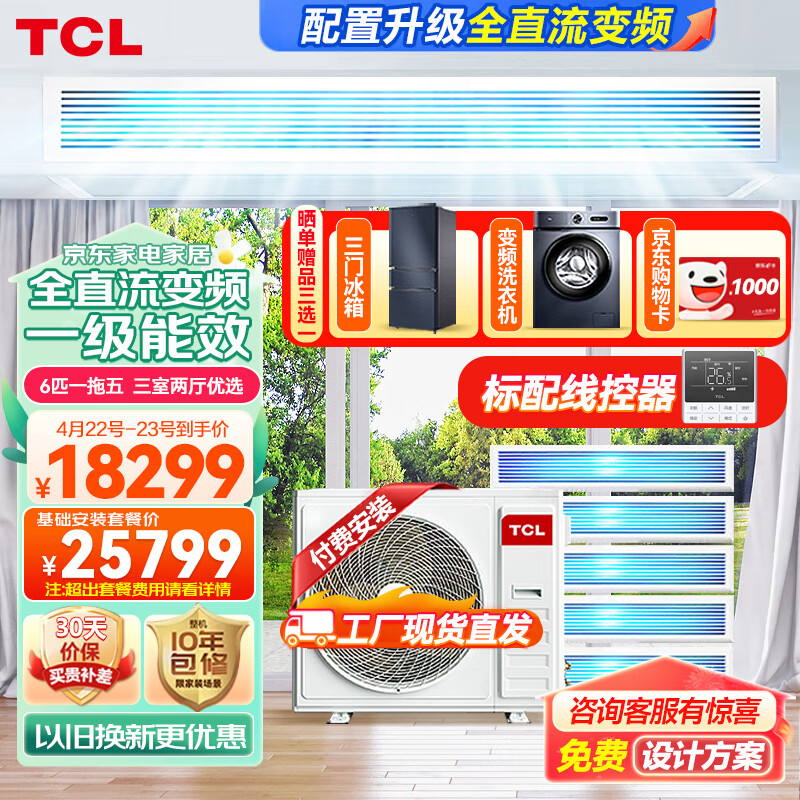 TCL中央空调6匹一拖五全直流变频新一级能效家用多联机风管机嵌入式空调 四室一厅 TMV-Vd140W/N1-D价格:20299.00元!
