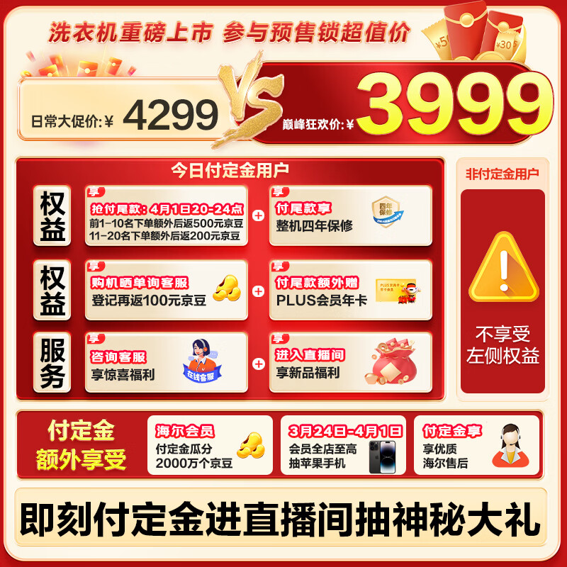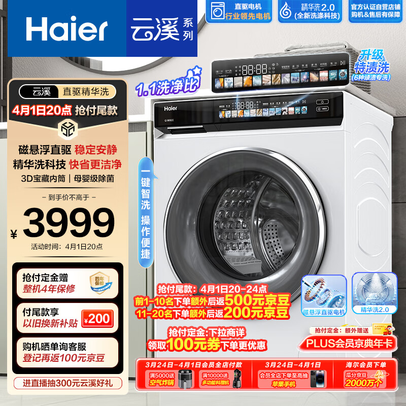海尔(Haier)直驱精华洗 云溪176 超薄滚筒洗衣机全自动家用 10公斤大容量 智能投放 以旧换新 EG100BD176PROW价格:4099.00元!