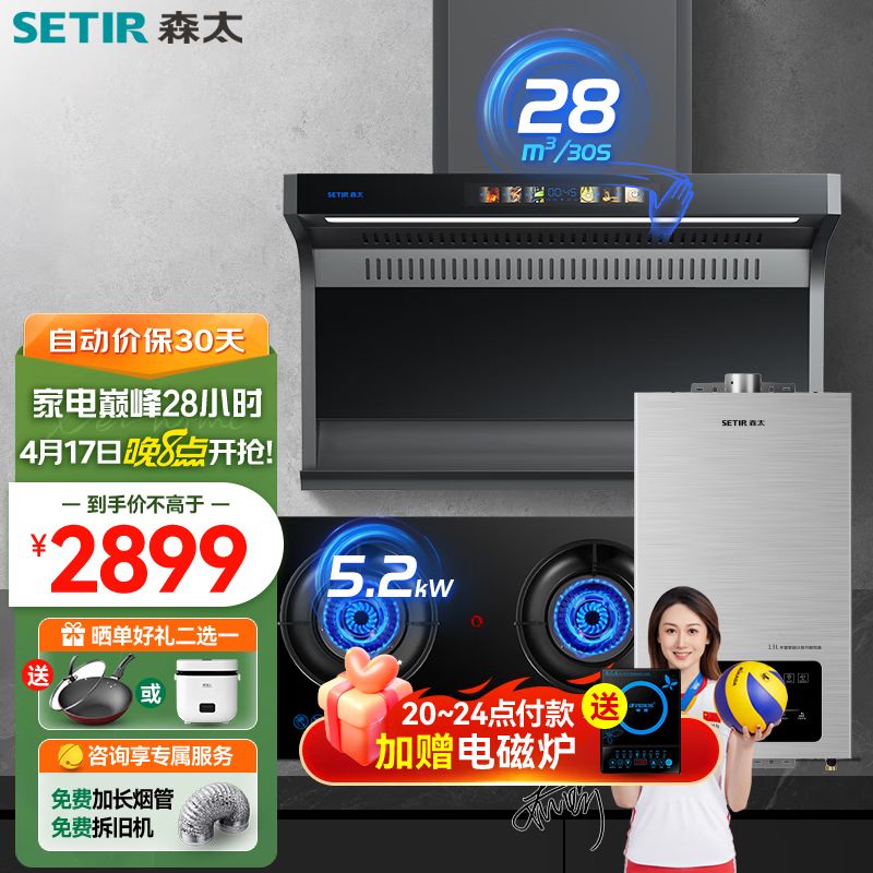 森太(SETIR)油烟机灶具燃热套装 顶侧双吸抽油烟机家用大吸力变频智能巡航 烟灶热三件套B929+TA19+C06 天然气价格:3199.00元!