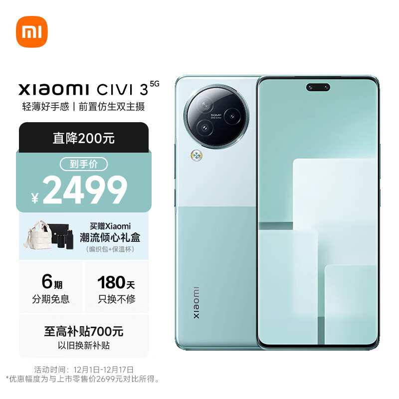 小米 Civi 3 前置仿生双主摄 天玑8200-Ultra 后置5000万光学防抖镜头 12GB+512GB 薄荷绿 小米手机 5G手机价格:2499.00元!