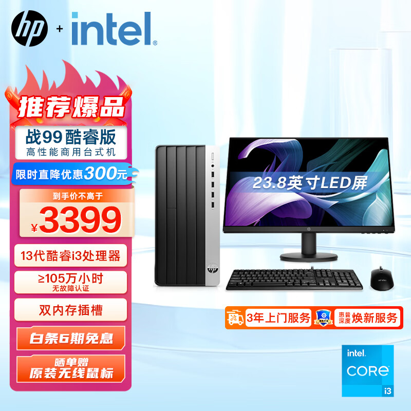 惠普(HP)战99 23款商务办公 教育学习台式电脑主机大机箱(酷睿版13代i3-13100 16G 512G)23.8英寸显示器价格:3399.00元!
