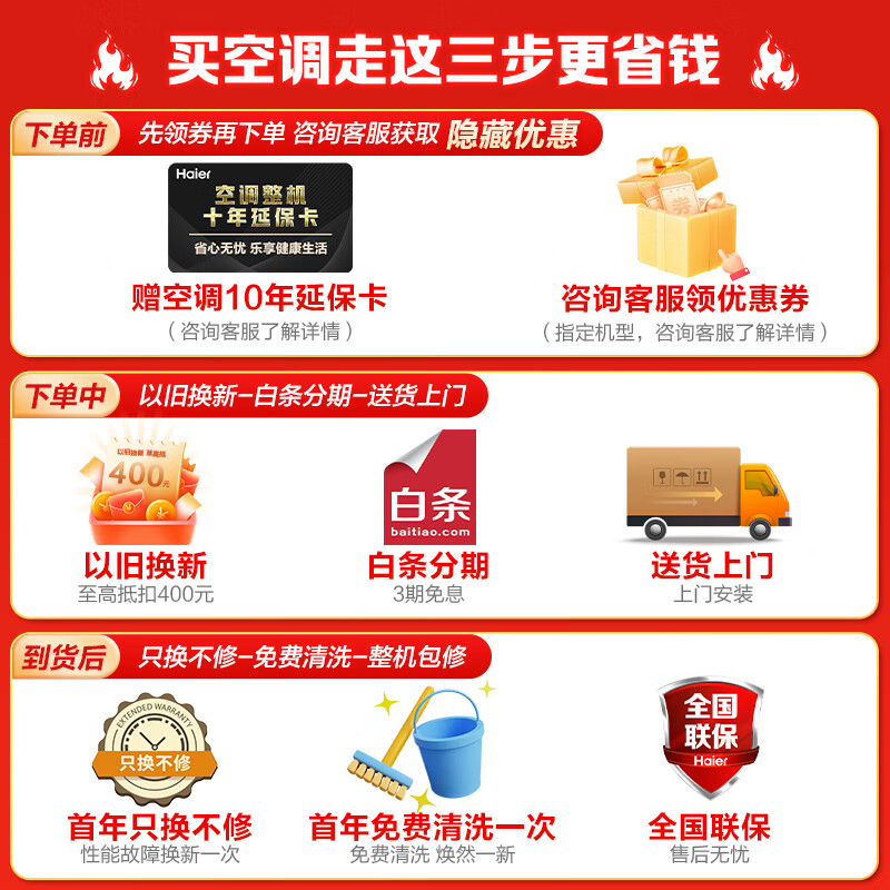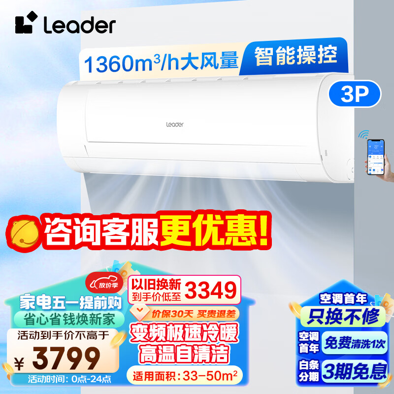 Leader空调海尔出品大3匹挂机 家用变频冷暖三级能效节能省电自清洁壁挂式空调 以旧换新 MDA83TU1[家电]价格:3799.00元!