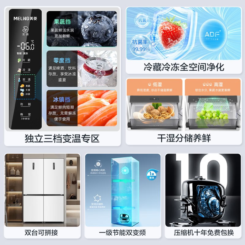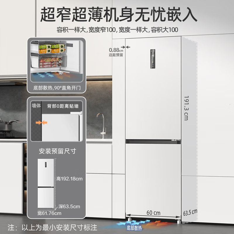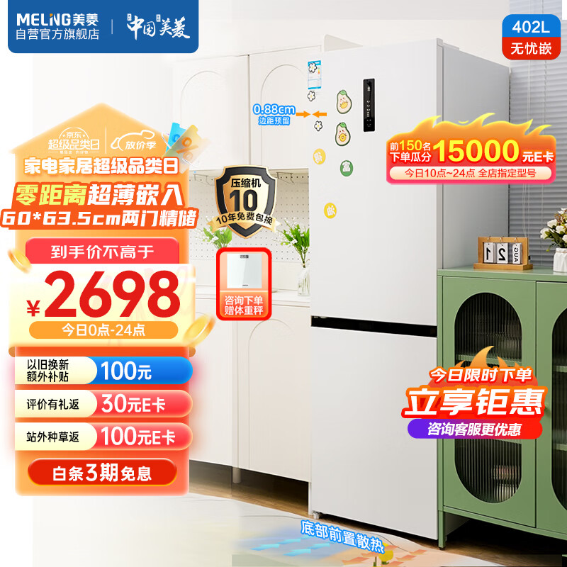 美菱(MeiLing)402升超薄零嵌入式两门双开门冰箱家用底部散热可拼接变频一级能效风冷无霜BCD-402WPCZX白价格:2698.00元!