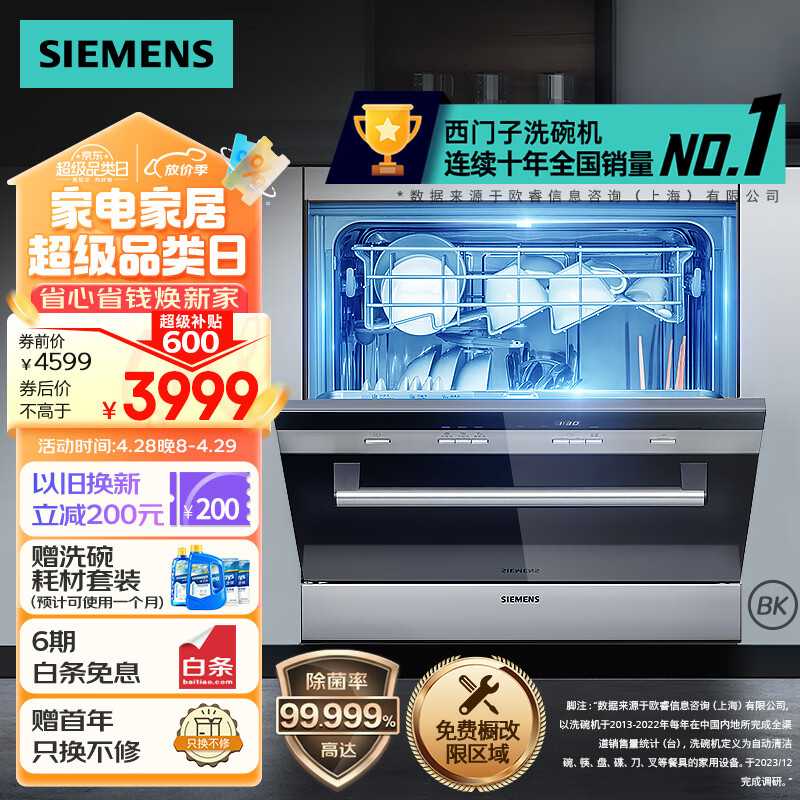 西门子西班牙原装进口 10套大容量 家用洗碗机嵌入式 双重烘干 高温除菌 96h储存 SC73M612TI价格:4599.00元!