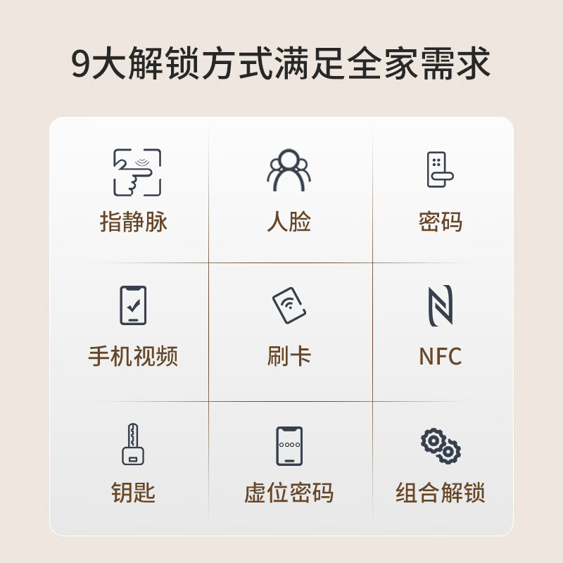开锁方式:NFC,临时密码,密码,人脸识别,手机小程序,刷卡,钥匙,指静脉