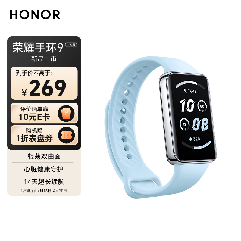 荣耀(HONOR)手环9 NFC版 云水蓝 轻薄双曲面 心脏健康守护 14天超长续航 智能手环运动手环价格:269.00元!