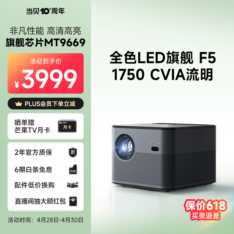 当贝 F5 投影仪 家用卧室投影机 家庭影院(全色LED旗舰 MT9669 1750 CVIA流明 双自动对焦 )价格:3999.00元!