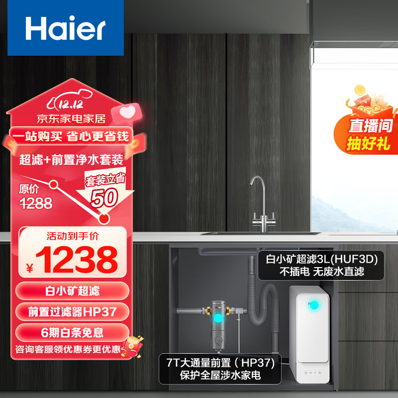 海尔(Haier)超滤净水器家用净水机直滤3L大流量饮用厨下式无桶厨房过滤器白小矿净水器+前置过滤器HUF3D+HP-37价格:1238.00元!