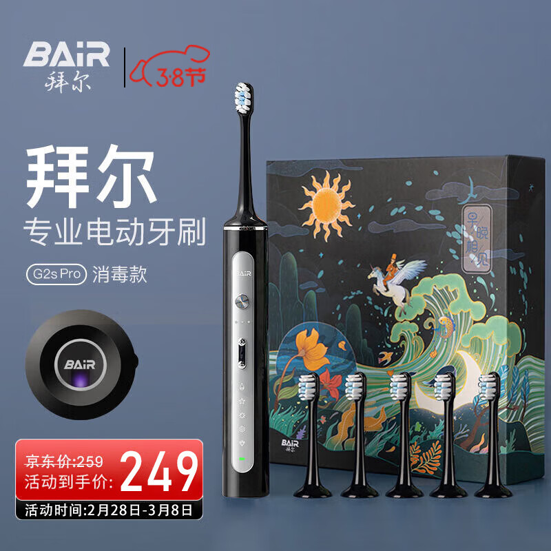 拜尔G2s pro 智能消毒电动牙刷成人震动充电智能声波学生情侣全自动男士女送朋友礼盒装 38节礼物价格:259.00元!