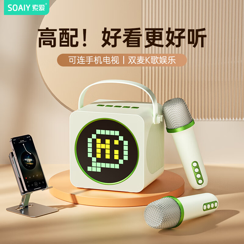 索爱(soaiy)话筒音响一体自带声卡k歌麦克风家庭ktv音响套装无线蓝牙音箱唱歌神器儿童娱乐SK15双麦苹果绿价格:293.00元!