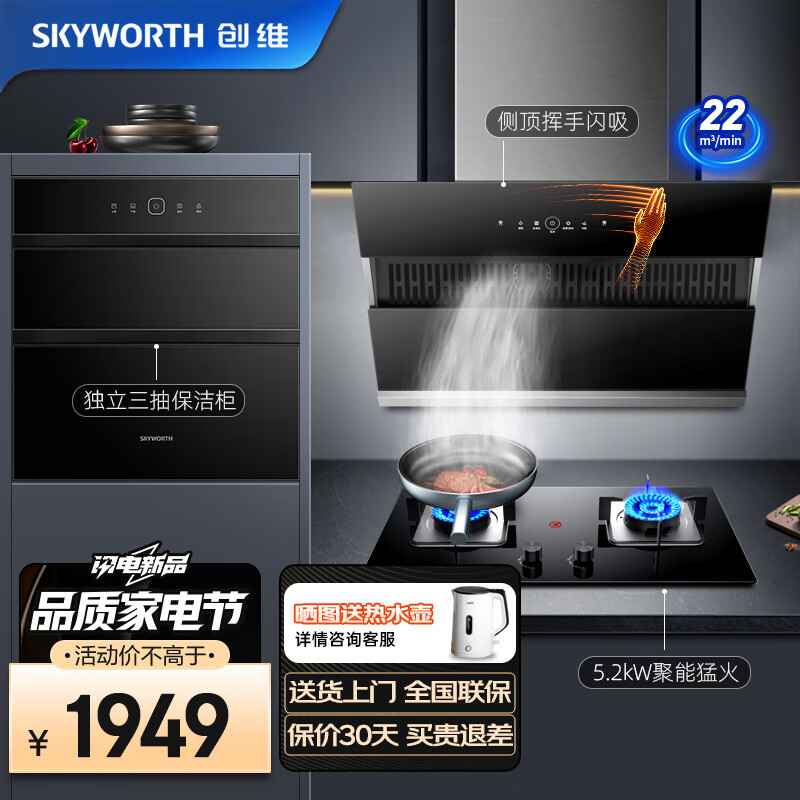 创维(Skyworth)侧吸烟灶消三件套 22风量小尺寸油烟机 5.2kW燃气灶家用三层嵌入式二星消毒柜Y101+Z50BS-1+X20A/T价格:1949.00元!
